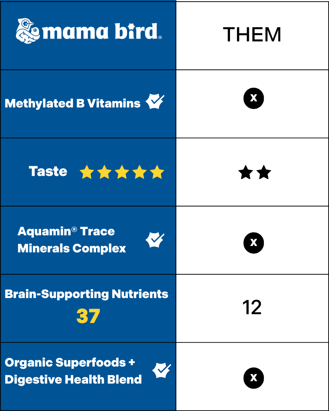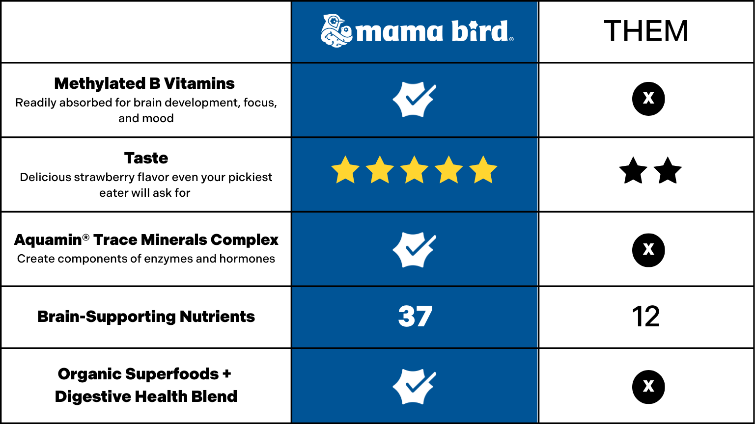 Mama Bird® Kids Multi+ was crafted by Dr. Mika Gupta, a neurologist and mom who saw firsthand how nutrition gaps were impacting children’s growth, learning, and happiness.