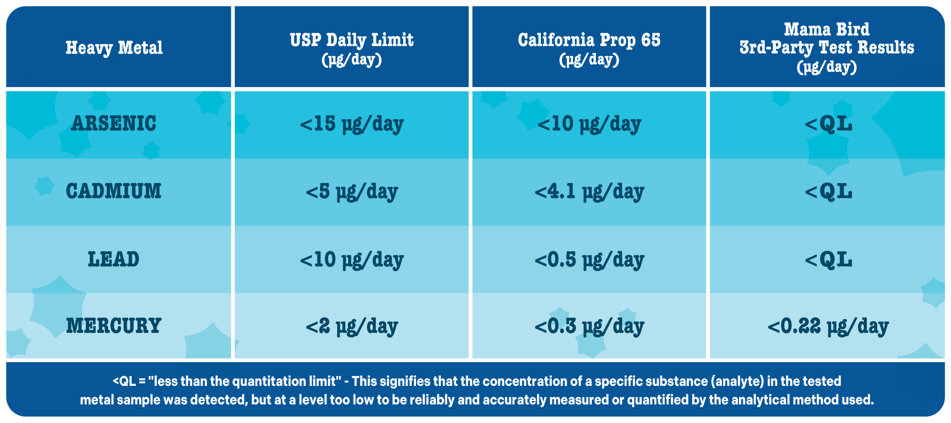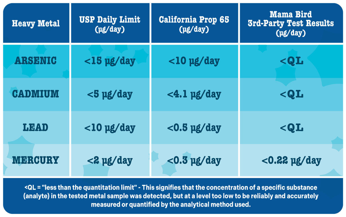 - Mama Bird supplements are tested every single batch by independent, ISO-accredited labs for heavy metals—along with potency, purity, and microbiology—so you know exactly what you’re taking.