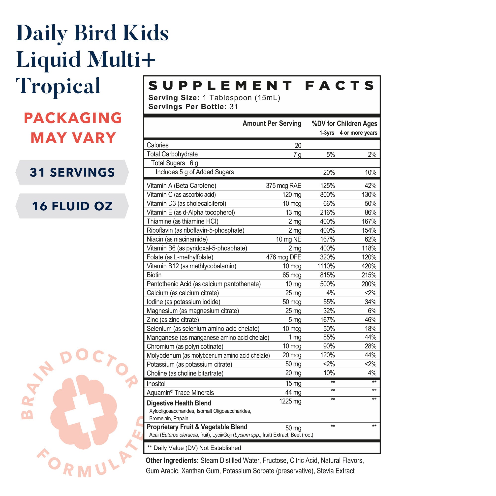 Servings per Bottle: 31Amount Per Serving %DV for Children Ages 1-3 yrs 4 or more years Calories 20 Total Carbohydrate 7 g 5% 2% Total Sugars 6 g Includes 5 g of Added Sugars 20% 10% Vitamin A (Beta Carotene) 375 mcg RAE 125% 42% Vitamin C (Ascorbic Acid) 120 mg 800% 130% Vitamin D (Cholecalciferol from Lichen) 10 mcg 66% 50% Vitamin E (d-Alpha Tocopheryl Succinate) 13 mg 215% 86% Thiamine (Thiamine HCl) 2 mg 400% 167% Riboflavin (Riboflavin-5-Phosphate) 2 mg 400% 154% Niacin (Niacinamide) 10 mg NE 167% 62% Vitamin B6 (Pyridoxal-5-Phosphate) 2 mg 400% 118% Folate (L-5-Methyltetrahydrofolate Calcium) 476 mcg DFE 320% 120% Vitamin B12 (Methylcobalamin) 10 mcg 1110% 420% Biotin 65 mcg 815% 215% Pantothenic acid (Calcium Pantothenate) 10 mg 500% 200% Calcium (Calcium Citrate) 25 mg 4% <2% Iodine (Potassium Iodine) 50 mcg 55% 34% Magnesium (Magnesium Citrate) 25 mg 32% 6% Zinc (Zinc Citrate) 5 mg 167% 46% Selenium (Selenium Amino Acid Chelate) 10 mcg 50% 18% Manganese (Manganese Amino Acid Chelate) 1 mg 85% 44% Chromium (Polynicotinate) 10 mcg 90% 28% Molybdenum (Molybdenum Amino Acid Chelate) 20 mcg 120% 44% Potassium (Potassium Citrate) 50 mg <2% <2% Choline (Choline Bitartrate) 20 mg 10% 4% Inositol 15 mg ** ** Aquamin® Trace Mineral Complex 44 mg ** ** Digestive Health Blend Fructooligosaccharides, Isomalt Oligosaccharides, Bromelain, Papain 1.22 g ** ** Fruit & Vegetable Blend Goji (Berry) Extract, Acai (Fruit) Extract, Beet (Root) 50 mg ** ** ** Percent Daily Value is based on a 2,000 calorie diet Other Ingredients: Steam Distilled Water, Fructose, Citric Acid, Natural Flavors, Xanthan Gum, Gum Arabic, Potassium Sorbate (preservative), Stevia