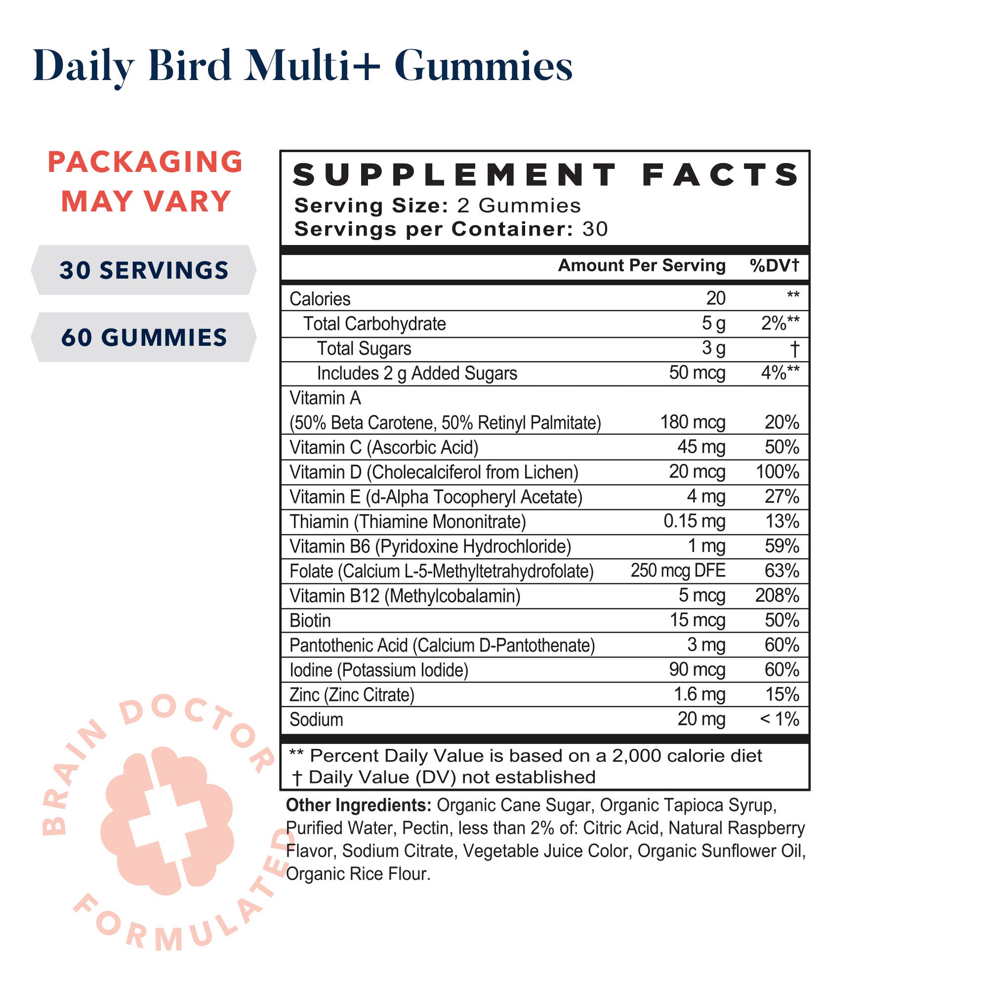 Servings per Bottle: 30Amount Per Serving %DV Calories 20 ** Total Cabohydrate 5 g 2%** Total Sugars 3 g † Includes 2g Added Sugars 50 mcg 4%** Vitamin A (50% Beta-Carotene, 50% Retinyl Palmitate) 180 mcg 20% Vitamin C (Ascorbic Acid) 45 mg 50% Vitamin D (Cholecalciferol from Lichen) 20 mcg 100% Vitamin E (d-Alpha Tocopheryl Succinate) 4mg 27% Thiamin (Thiamine Mononitrate) 0.15 mg 13% Vitamin B6 (Pyridoxine Hydroclyoride) 1 mg 59% Folate (Calcium L-5 Methyltetrahydrofolate) 250 mcg DFE 63% Vitamin B12 (Methylcobalamin) 5 mcg 208% Biotin 15 mcg 50% Pantothenic Acid (Calcium Pantothenate) 3 mg 60% Iodine (Potassium Iodide) 90 mcg 60% Zinc (Zinc Citrate) 1.6 mg 15% Sodium 20 mg <1% ** Percent Daily Value is based on a 2,000-calorie diet † Daily Value (DV) not established Other Ingredients: Organic Cane Sugar, Organic Tapioca Syrup, Purified Water, Pectin, less than 2% of Citric Acid, Natural Raspberry Flavor, Sodium Citrate, Vegetable Juice Color, Organic Sunflower Oil, Organic Rice Flour