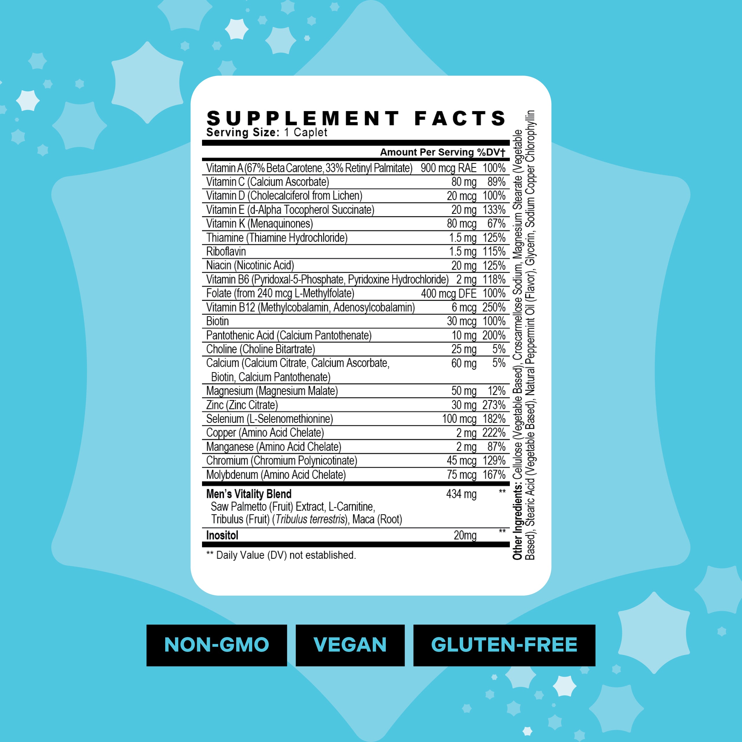 Servings per Bottle: 30Amount Per Serving %DV Vitamin A (67% Beta Carotene, 33% Retinyl Palmitate) 900 mcg RAE 100% Vitamin C (Calcium Ascorbate) 80 mg 89% Vitamin D (Cholecalciferol from Lichen) 20 mcg 100% Vitamin E (d-Alpha Tocopheryl Succinate) 20 mg 133% Vitamin K (Menaquinones) 80 mcg 67% Thiamine (Thiamine Hydrochloride) 1.5 mg 125% Riboflavin 1.5 mg 115% Niacin (Nicotinic Acid) 20 mg 125% Vitamin B6 (Pyridoxal-5-Phosphate, Pyridoxine Hydrochloride) 2 mg 118% Folate (from 240mcg L-Methylfolate) 400 mcg DFE 100% Vitamin B12 (Methylcobalamin, Adenosylcobalamin) 6 mcg 250% Biotin 30 mcg 100% Pantothenic acid (Calcium Pantothenate) 10 mg 200% Choline (Choline Bitartrate) 25 mg 5% Calcium (Calcium Citrate, Calcium Ascorbate, Biotin, Calcium Pantothenate) 60 mg 5% Magnesium (Magnesium Malate) 50 mg 12% Zinc (Zinc Citrate) 30 mg 273% Selenium (L-Selenomethionine) 100 mcg 182% Copper (Amino Acid Chelate) 2 mg 222% Manganese (Amino Acid Chelate) 2 mg 87% Chromium (Chromium Polynicotinate) 45 mcg 129% Molybdenum (Amino Acid Chelate) 75 mcg 167% Men's Vitality Blend Saw Palmetto (Fruit) Extract, L-Carnitine, Tribulus (Fruit) (Tribulus Terrestis), Maca (Root) 434 mg ** Inositol 20 mg ** ** Daily Values (DV) not established Other Ingredients: Cellulose (Vegetable Based), Croscamellose Sodium, Magnesium Stearate (Vegetable Based), Stearic Acid (Vegetable Based), Natural Peppermint Oil (Flavor), Glycerin, Sodium Copper Chlorophyllin